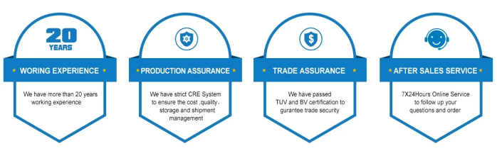 ● 我们有严格的质量控制体系,所有产品将仔细检查至少3次(在生产过程中,成品生产和QC装载前),这使我们能够保证完全满意的客户。